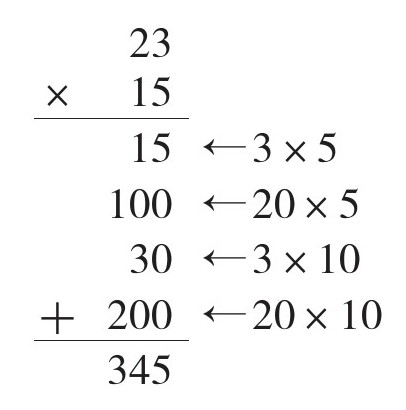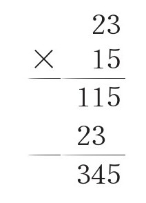 比如,在计算23×15时,如果心算算不出来,我们就会列出下面的算式进行笔算: