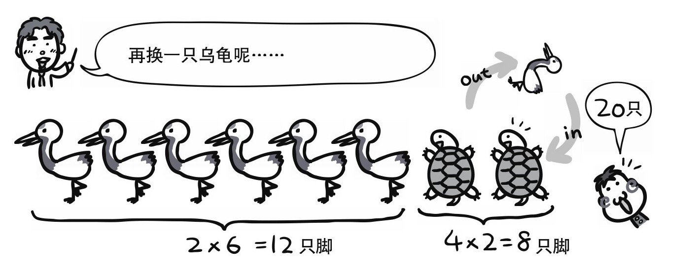 怎么样?学会了吗?不过你现在要考虑的问题并不是是否学会了龟鹤算,而是思考“为什么这样解题”。