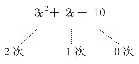 在上面的例子中,使用数字和字母进行乘法运算,得到的式子叫作单项式。由多个单项式的和(或差)组成的式子叫作多项式。比如下面的式子,就是二次三项式。