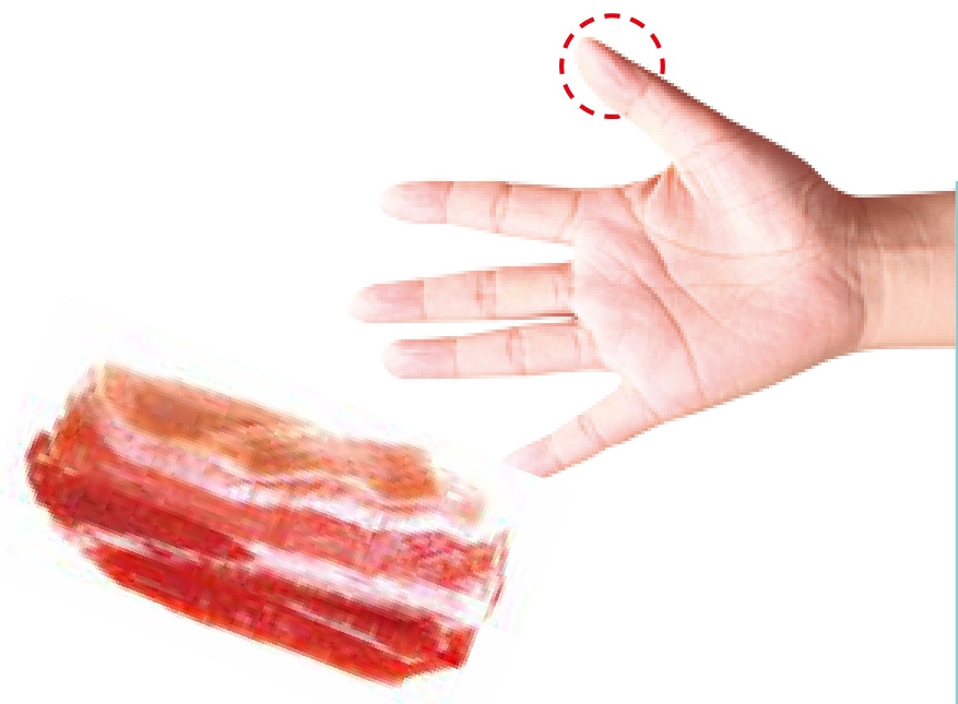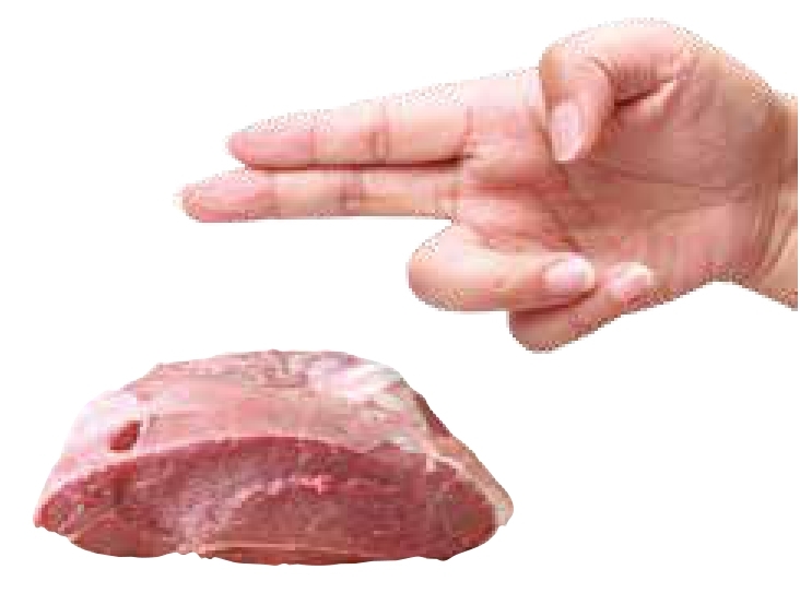 切一块与食指厚度相同、与两指(食指和中指并拢)的长度和宽度相同的瘦肉,相当于50克的量,即可满足人体一天的需求。