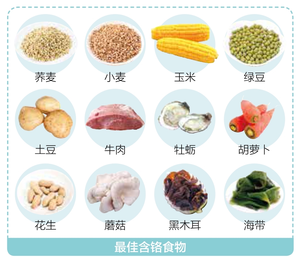 铬与烟酸、谷胱甘肽一起组成葡萄糖耐量因子(GTF),它是胰岛素的辅助因子,可增加胰岛素的效能,促进机体对葡萄糖的利用。可以说,铬是胰岛素的“加强剂”。铬还可改善血脂和血胆固醇水平,保持血管畅通,避免并发心脑血管疾病。