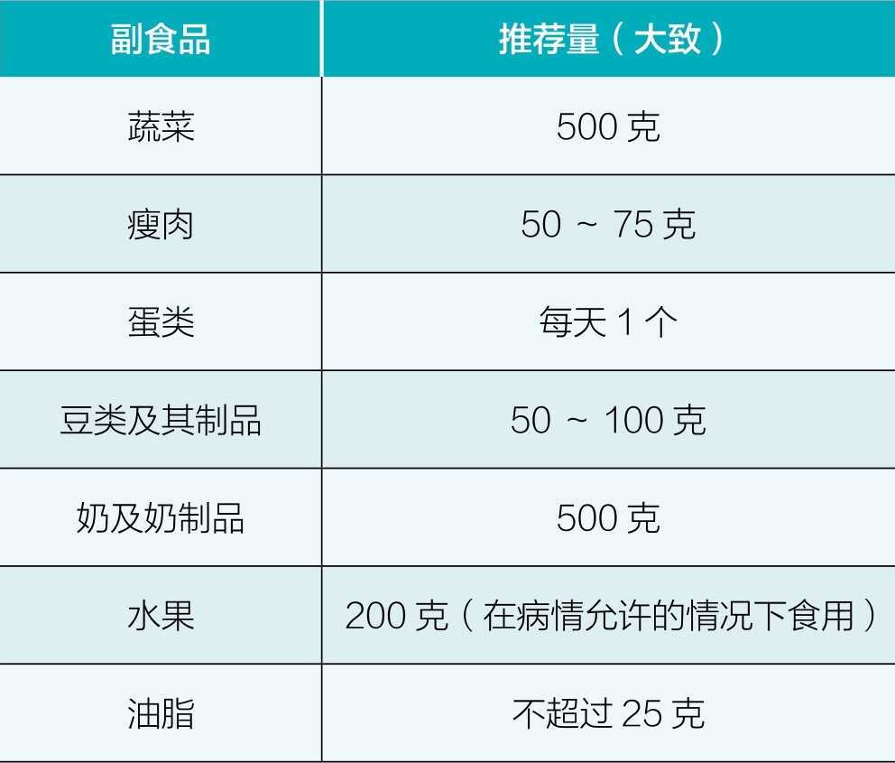 副食是指除了主食外,用来下饭的蔬菜、肉类、蛋、豆类及其制品、奶、水果、油脂等。每天需要的热量减去主食量,即为副食量。