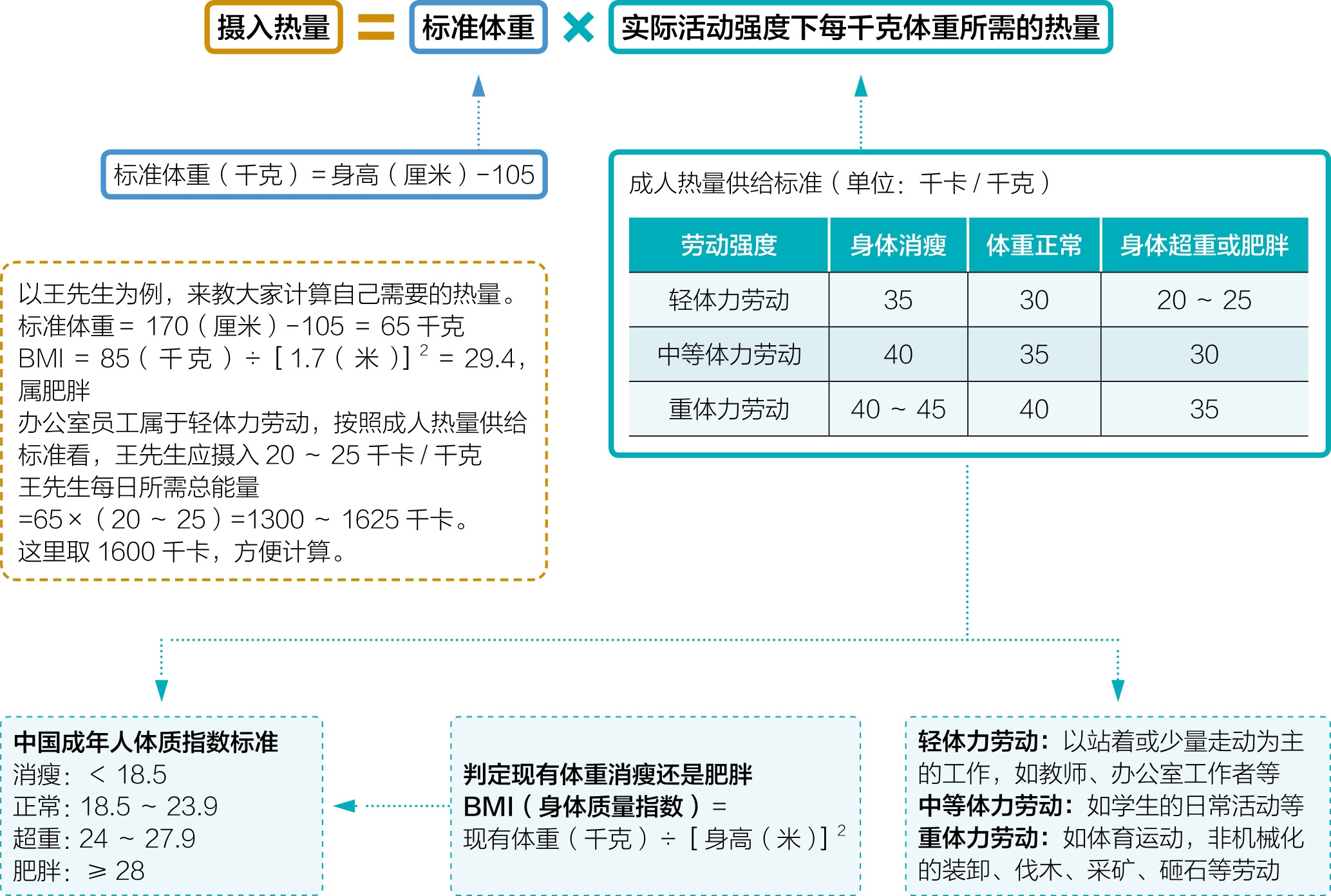 为了让读者朋友更好地掌握安排糖尿病患者日常饮食的方法,我们用下面的这个例子一步一步地详细讲解:王先生,58岁,身高170厘米(1.70米),体重为85千克,从事办公室工作,患糖尿病4年,一直采用单纯的饮食治疗,没有出现明显的并发症。接下来,将为大家演示一下怎样为其安排日常的饮食。