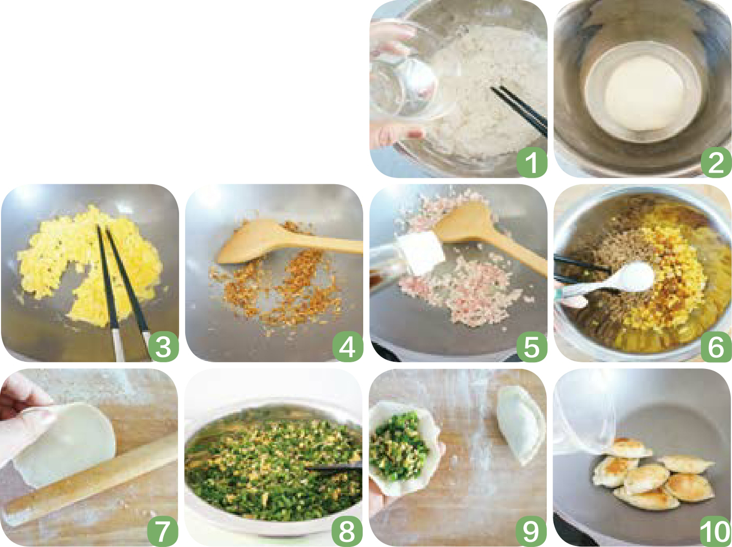 原料: 韭菜150克,猪前槽肉200克,土鸡蛋3个,虾皮20克,中筋面粉200克,90℃热水120克。