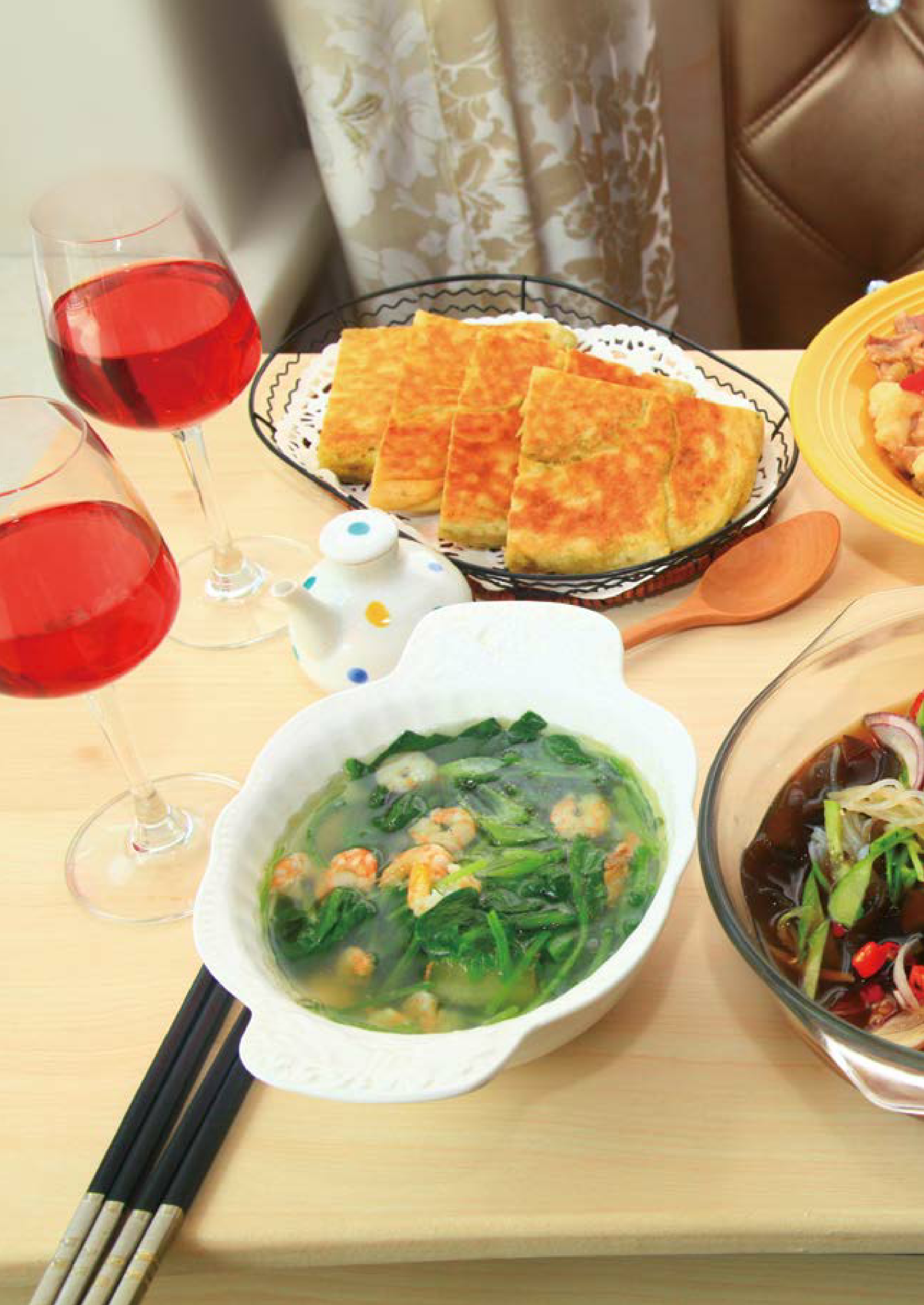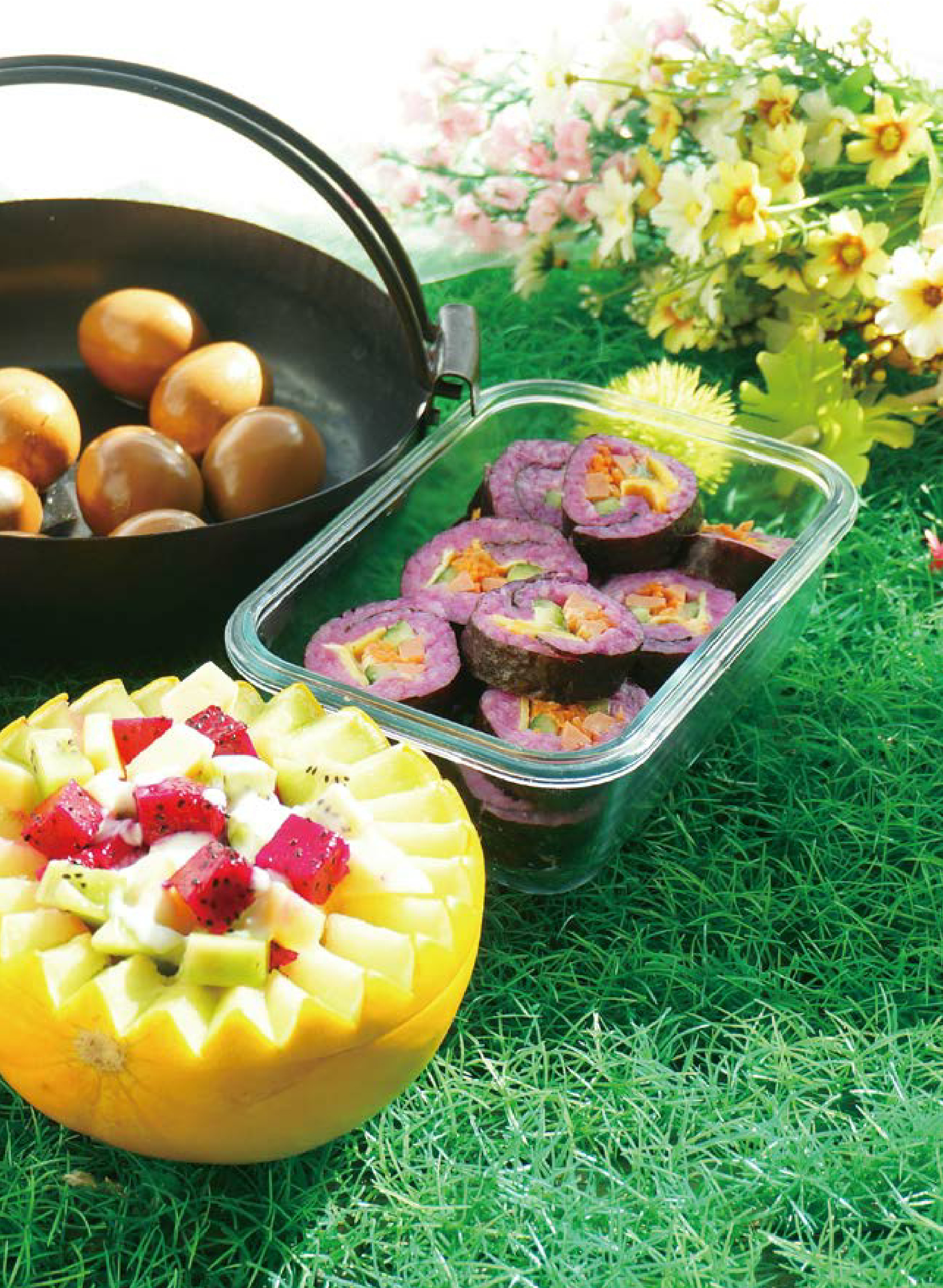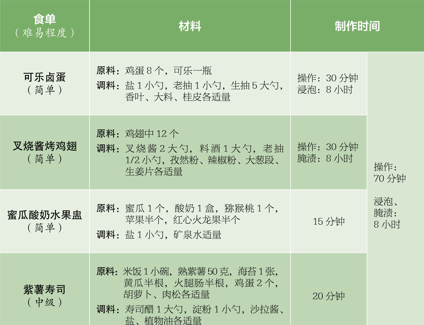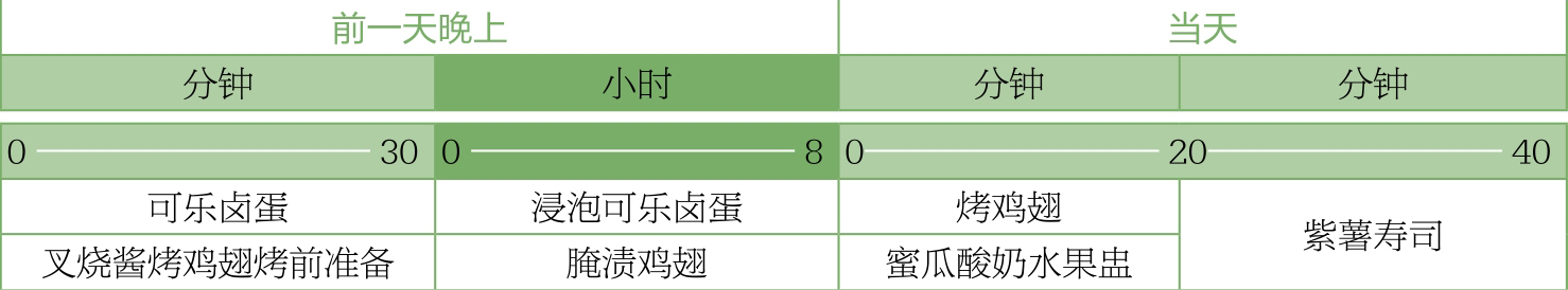 前一天晚上做可乐卤蛋,在煮蛋的过程中完成叉烧酱烤鸡翅的烤前准备,接着将卤蛋浸泡一夜,将鸡翅腌渍一夜。当天先做叉烧酱烤鸡翅,在烤鸡翅的过程中做蜜瓜酸奶水果盅,最后做紫薯寿司。整个套餐的操作时间大约为70分钟,浸泡卤蛋和腌渍鸡翅需要一夜(约8小时)。
