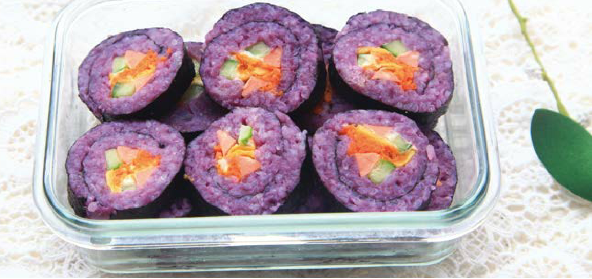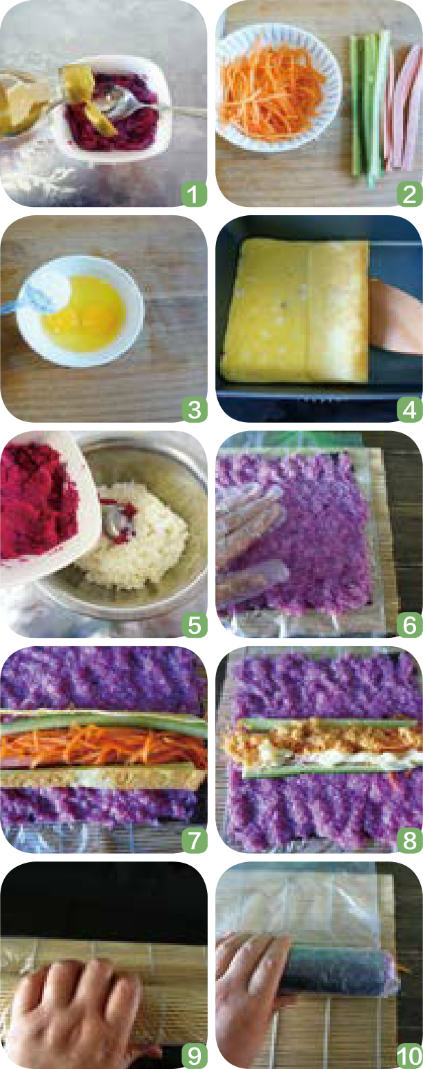 紫薯寿司: 紫薯富含硒和花青素,具有抗癌、美容的功效。