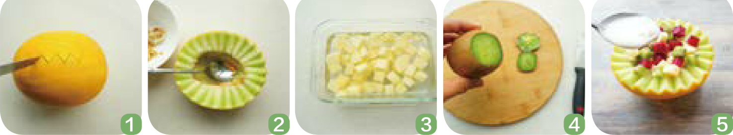 5.火龙果去皮切丁。把水果丁都放入蜜瓜里,吃的时候淋上酸奶即可。