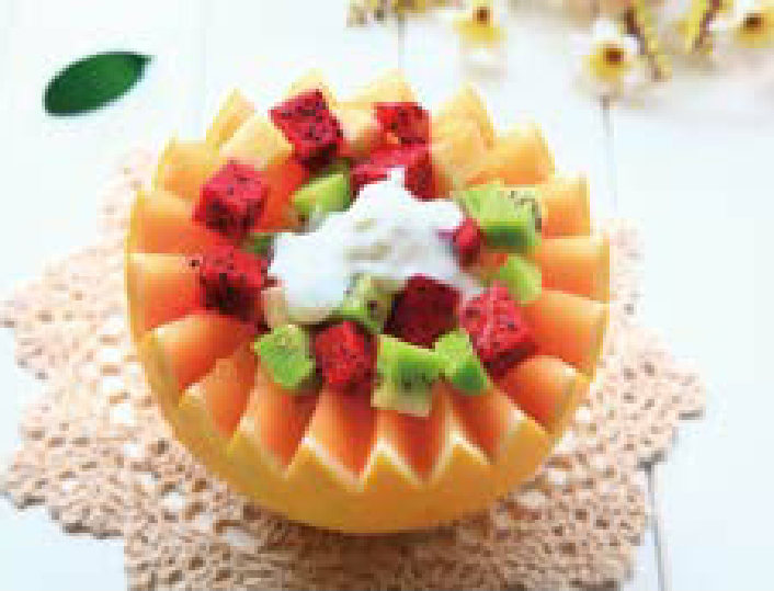 蜜瓜酸奶水果盅: 酸奶含人体容易吸收的蛋白质和钙质,水果含有较多果糖和维生素C,有止渴生津、润肠通便的功效。