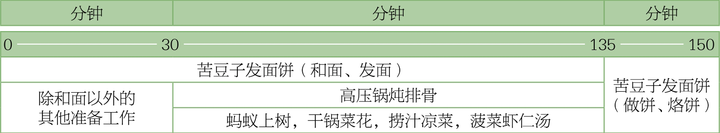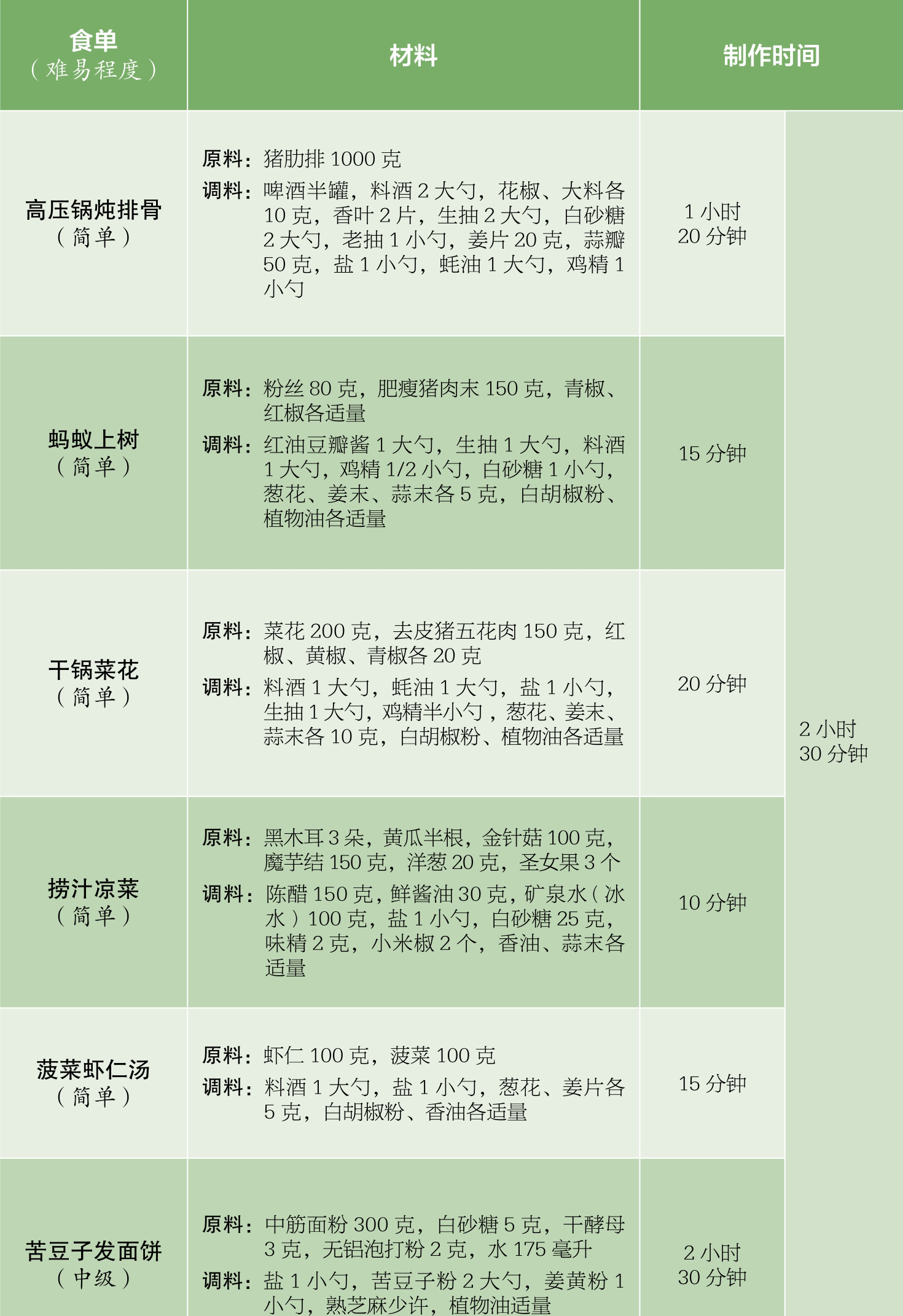 首先为做苦豆子发面饼和面、发面,然后做其他准备工作,接着做高压锅炖排骨。在等待面团发酵和炖排骨的过程中做蚂蚁上树、干锅菜花、捞汁凉菜和菠菜虾仁汤,最后做苦豆子发面饼。制作整个套餐需要大约2小时30分钟。