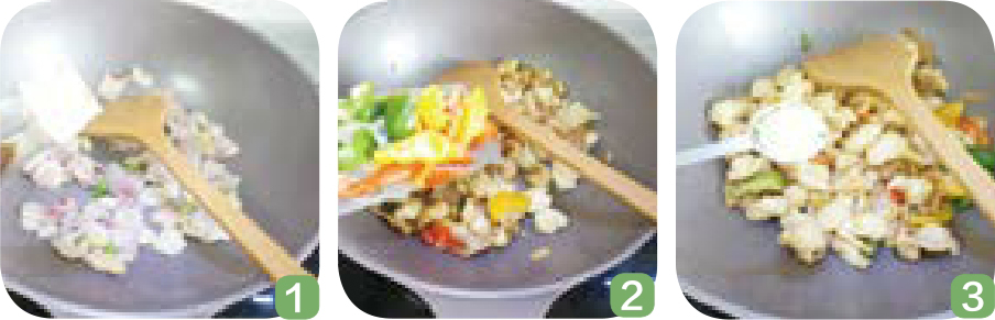 2.放入菜花、红椒块、黄椒块、青椒块翻炒。