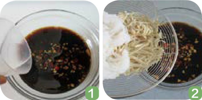 1.粉丝里倒入适量植物油,用筷子拌匀。