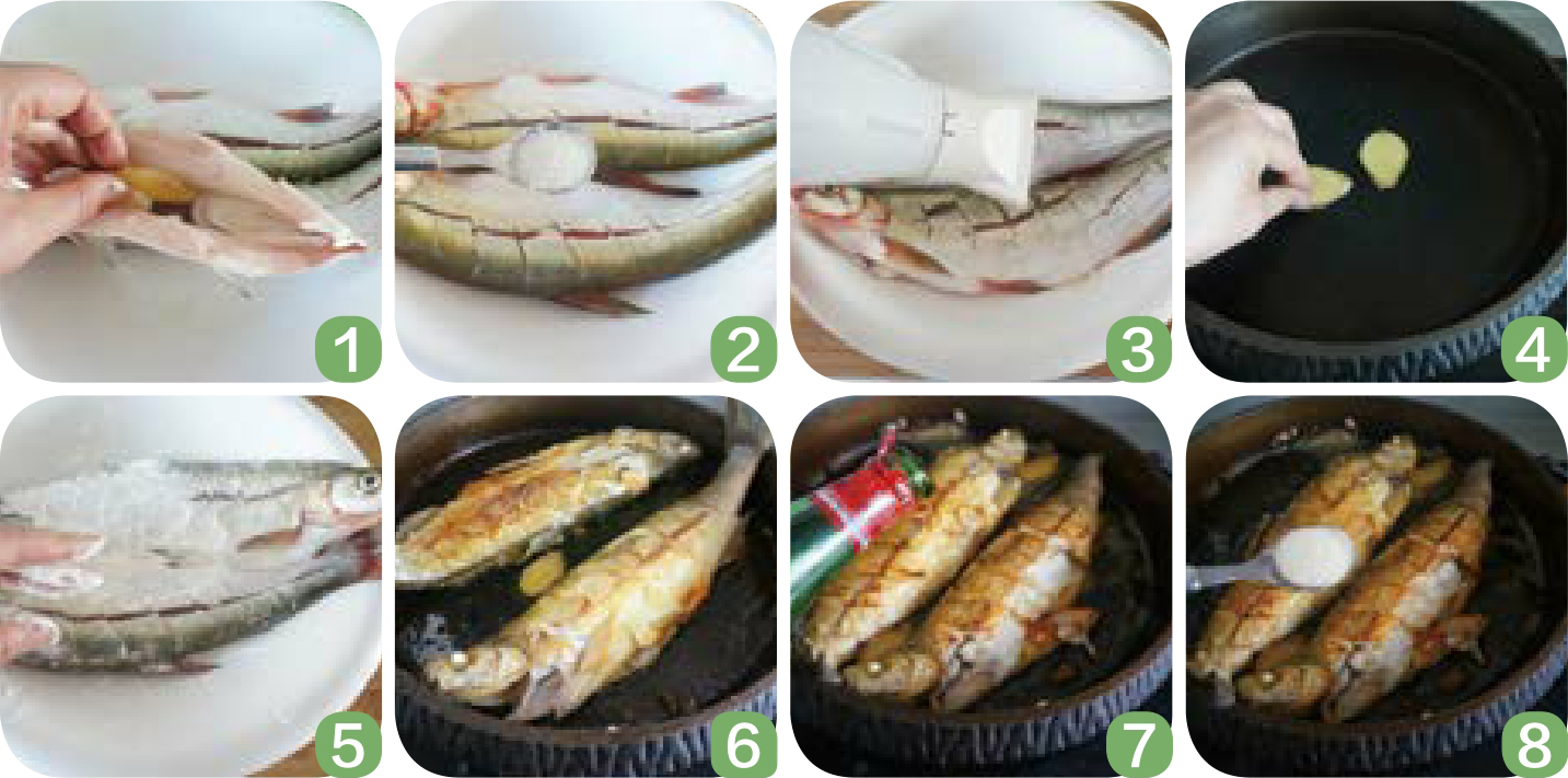 6 起油锅,锅热后放入白鱼,中火煎到一面金黄后翻面再煎。
