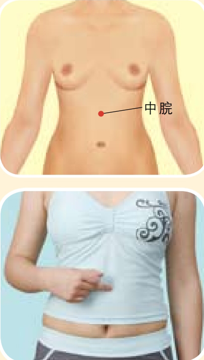 按摩方法 :取坐位或仰卧位,用食指或中指向下按压中脘穴半分钟,然后按顺时针方向按揉约2分钟,以局部有酸胀感为佳。
