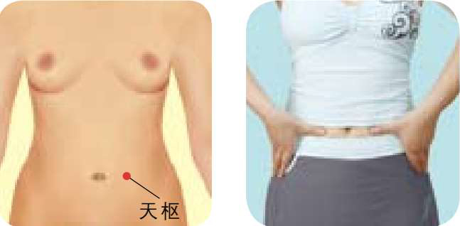 ● 按摩方法 :取坐位或仰卧位,用双手拇指或中指按压同侧天枢穴半分钟,然后按顺时针方向按揉2分钟,以局部感到酸胀并向整个腹部放散为佳。