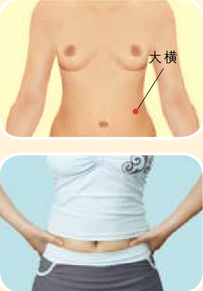 ● 按摩方法 :取坐位或仰卧位,用双手拇指点按同侧大横穴半分钟,其余四指分别附在两侧腰部,再按顺时针方向按揉约2分钟,以局部感到酸胀并向整个腹部放射为好。