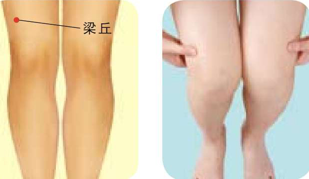 ● 按摩方法 :取坐位,屈膝,用双手拇指指尖压迫梁丘穴约1分钟,再向外按揉2分钟。