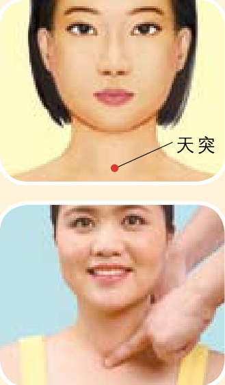 按摩方法 :取坐位,用右手食指尖点于天突穴,食指末节与颈项平行,指力沿胸骨柄的后缘向下点1分钟,以不影响呼吸为宜。