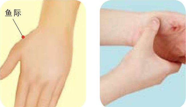 按摩方法 :用一手拇指按于另一手的鱼际穴,按顺时针方向按揉2分钟,以酸胀感向上蹿为最佳效果。