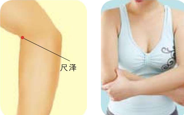 按摩方法 :取坐位,手臂半屈,用一手拇指指尖掐按对侧尺泽穴1分钟,再按顺时针方向按揉2分钟。