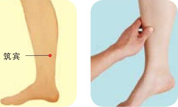 按摩方法 :按摩者用拇指按顺时针方向按揉筑宾穴约2分钟,然后按逆时针方向按揉约2分钟,以局部感到酸胀为佳。
