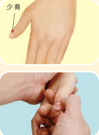 ● 按摩方法 :用指甲掐按少商穴30秒,放松10秒,反复操作10次,左右手交替进行。