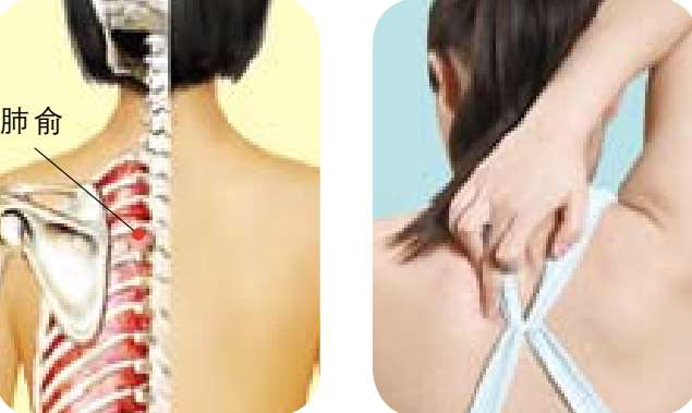 ● 按摩方法 :取坐位,用左手掌根搭于右侧肩井穴,中指指尖按定右侧肺俞穴,按揉2分钟,然后换右手。