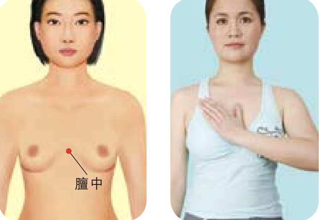 ● 按摩方法 :以左手大鱼际或掌根贴于膻中穴,按逆时针方向揉30~40次,再换右手按顺时针方向揉30~40次。