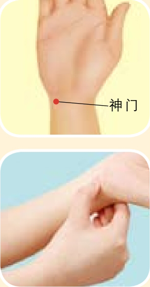 ● 按摩方法 :一手拇指指尖掐按另一手的神门穴约1分钟,左右手交替进行,以局部有酸胀感为佳。