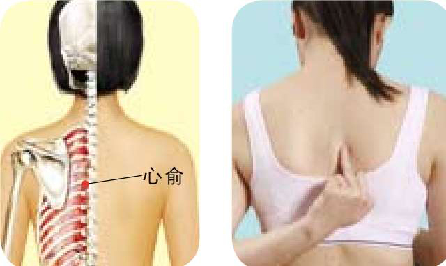 ● 按摩方法 :取坐位,双手中指指尖分别按于两侧心俞穴,按顺时针方向按揉2分钟,以局部产生酸胀感为度。
