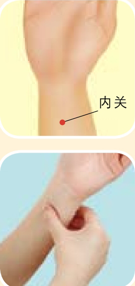 ● 按摩方法 :前臂半屈,用一手拇指指尖按于另一手的内关穴,食指或中指则按于外关穴,向内对按20~30次。