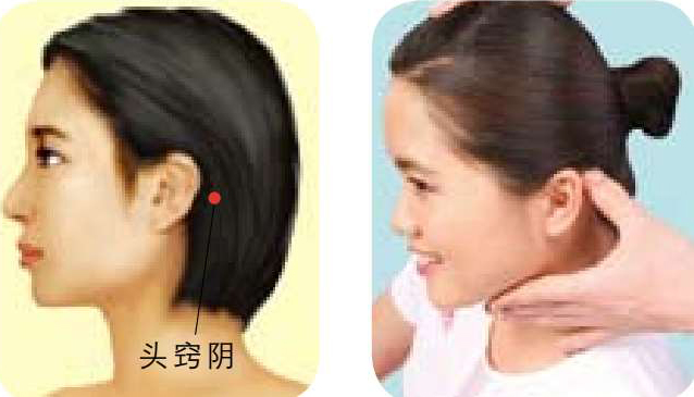 ● 按摩方法 :被按摩者坐位,按摩者坐于其背后,用两手拇指同时着力按压头窍阴穴半分钟;或一手扶住被按摩者的头部,一手拇指按压头窍阴穴半分钟,然后按顺时针方向按揉约2分钟,以局部有酸胀感为佳。