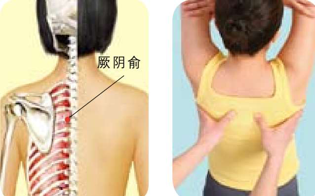 ● 按摩方法 :被按摩者取坐位或俯卧位,按摩者双手拇指按顺时针方向按揉厥阴俞穴约2分钟,然后按逆时针方向按揉2分钟,揉至局部发热为度。