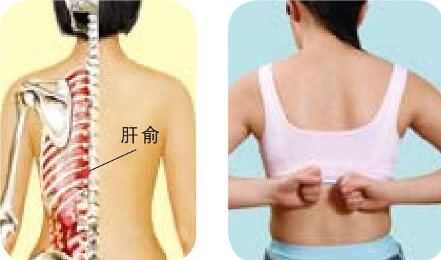 ● 按摩方法 :取坐位,两手握拳,用四指的掌指关节突起部着力点揉肝俞穴,同时向下移动,操作约2分钟。
