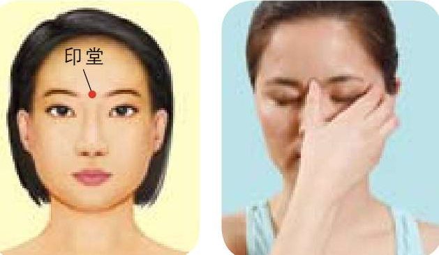 ● 按摩方法 :取坐位或仰卧位,以一手拇指放于印堂穴,其余四指附于对侧目外,以拇指指腹自印堂向上直推至发际止,反复推20~30次。