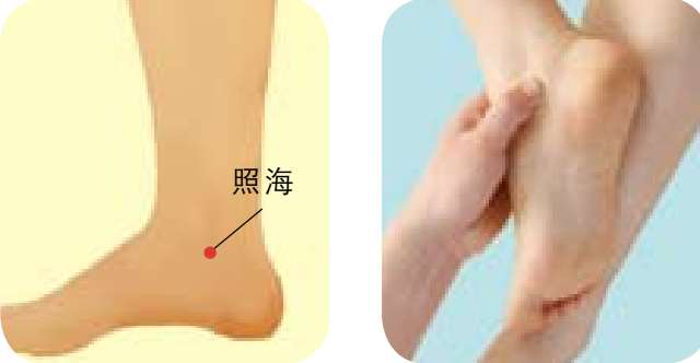 ● 按摩方法 :按摩者用手握住被按摩者的踝部,用拇指点压照海穴约1分钟,然后按顺时针方向揉1分钟,再按逆时针方向揉1分钟,以局部有酸胀感为佳。