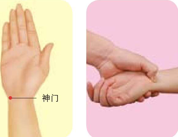 按摩方法 :被按摩者坐位,按摩者坐于其对面,用左手拇指点按被按摩者右手神门穴约1分钟,左右手交替进行,以局部有酸胀感为佳。