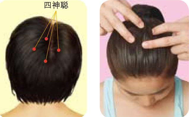 按摩方法 :被按摩者坐位,按摩者用双手的食指和中指分别对准四神聪穴,持续点揉1分钟,以局部有酸胀感为佳。
