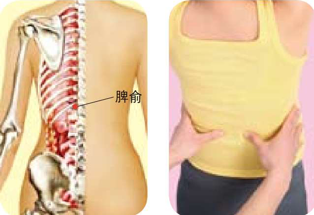 ● 按摩方法 :被按摩者俯卧,按摩者用两手拇指按在脾俞穴上,其余四指附着在肋骨上,按揉约2分钟,以局部有酸胀感为佳。