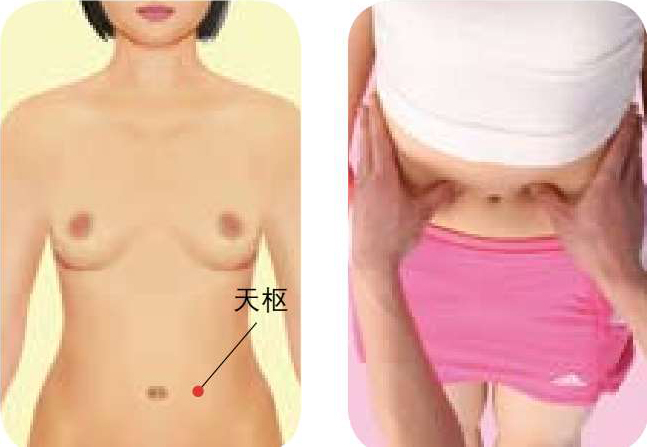 ● 按摩方法 :被按摩者仰卧,按摩者用拇指按顺时针方向按揉天枢穴半分钟,然后按逆时针方向按揉2分钟,以局部感到酸胀并向整个腹部放射为佳。