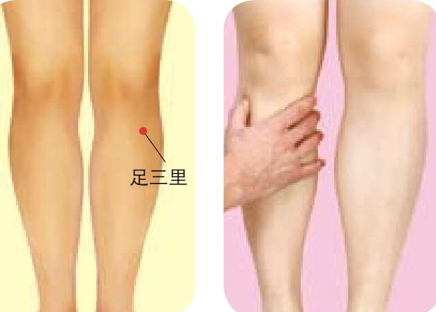 ● 按摩方法 :被按摩者仰卧,按摩者用拇指按顺时针方向按揉足三里穴2分钟,再按逆时针方向按揉2分钟,以局部感到酸胀为佳。