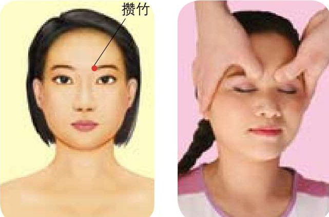 按摩方法 :被按摩者仰卧,按摩者坐于其头侧,用双手拇指或中指轻轻按揉攒竹穴约2分钟,以局部有酸胀感为佳。