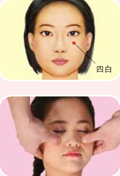 按摩方法 :被按摩者仰卧,按摩者坐于其头侧,用双手拇指按顺时针方向按揉四白穴约2分钟,然后按逆时针方向按揉约2分钟,以局部感到酸胀并向整个前额放射为好。