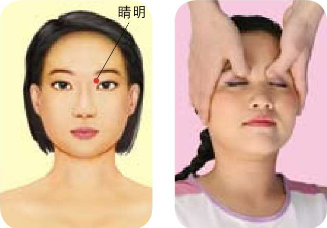 ● 按摩方法 :被按摩者仰卧,按摩者坐于其头侧,用双手拇指轻轻点按睛明穴约2分钟,以局部有酸胀感为佳。