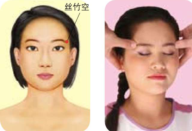● 按摩方法 :被按摩者仰卧,按摩者坐于其头侧,用双手拇指按顺时针方向按揉丝竹空穴约2分钟,然后按逆时针方向按揉约2分钟,以局部感到酸胀并向眼睛周围放散为好。