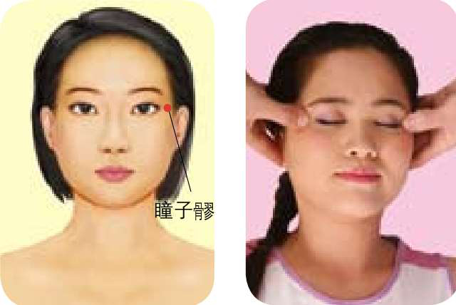 :被按摩者仰卧,按摩者坐于其头侧,用双手拇指或食指同时按压瞳子