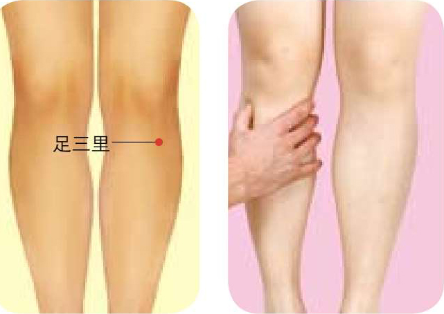 按摩方法 :被按摩者膝盖稍屈曲,按摩者用拇指按顺时针方向按揉足三里穴约2分钟,以局部感到酸胀为佳。