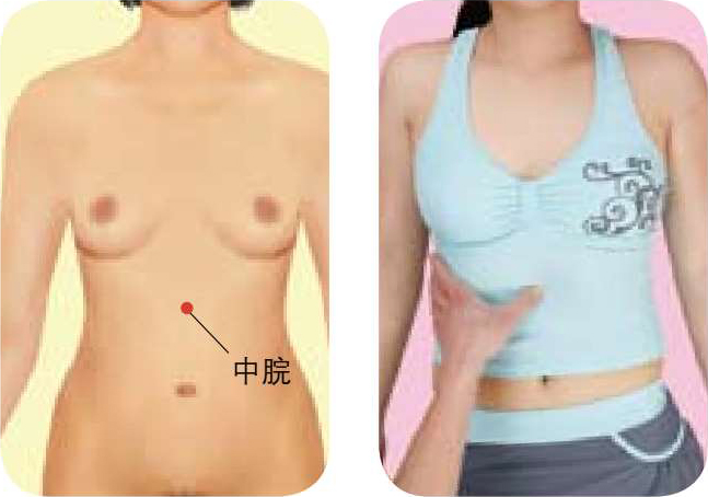 按摩方法 :被按摩者仰卧,按摩者用拇指或中指按压中脘穴约半分钟,然后按顺时针方向按摩约2分钟。