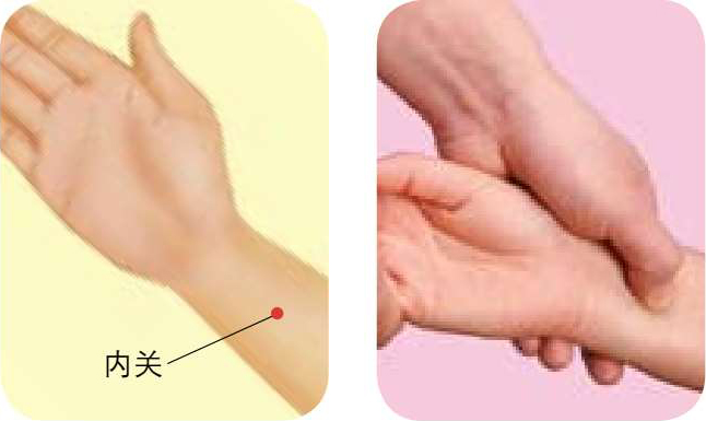 按摩方法 :按摩者一手托住被按摩者的前臂,另一手拇指或食指点按内关穴约1分钟,以酸胀感向腕部和手部放射为佳。