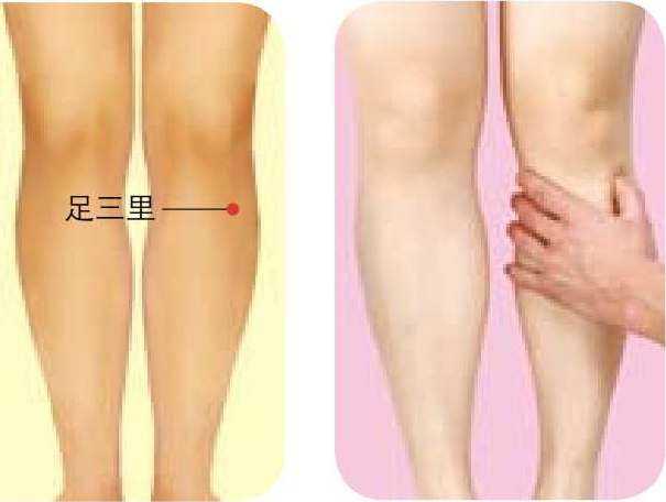 按摩方法 :被按摩者仰卧或坐位,膝盖稍屈曲,按摩者用拇指按顺时针方向按揉足三里穴约2分钟,然后按逆时针方向按揉约2分钟,以局部感到酸胀为佳。