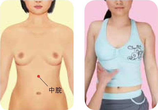 ● 按摩方法 :被按摩者仰卧,按摩者用拇指或中指按压中脘穴约半分钟,然后按顺时针方向按摩约2分钟。